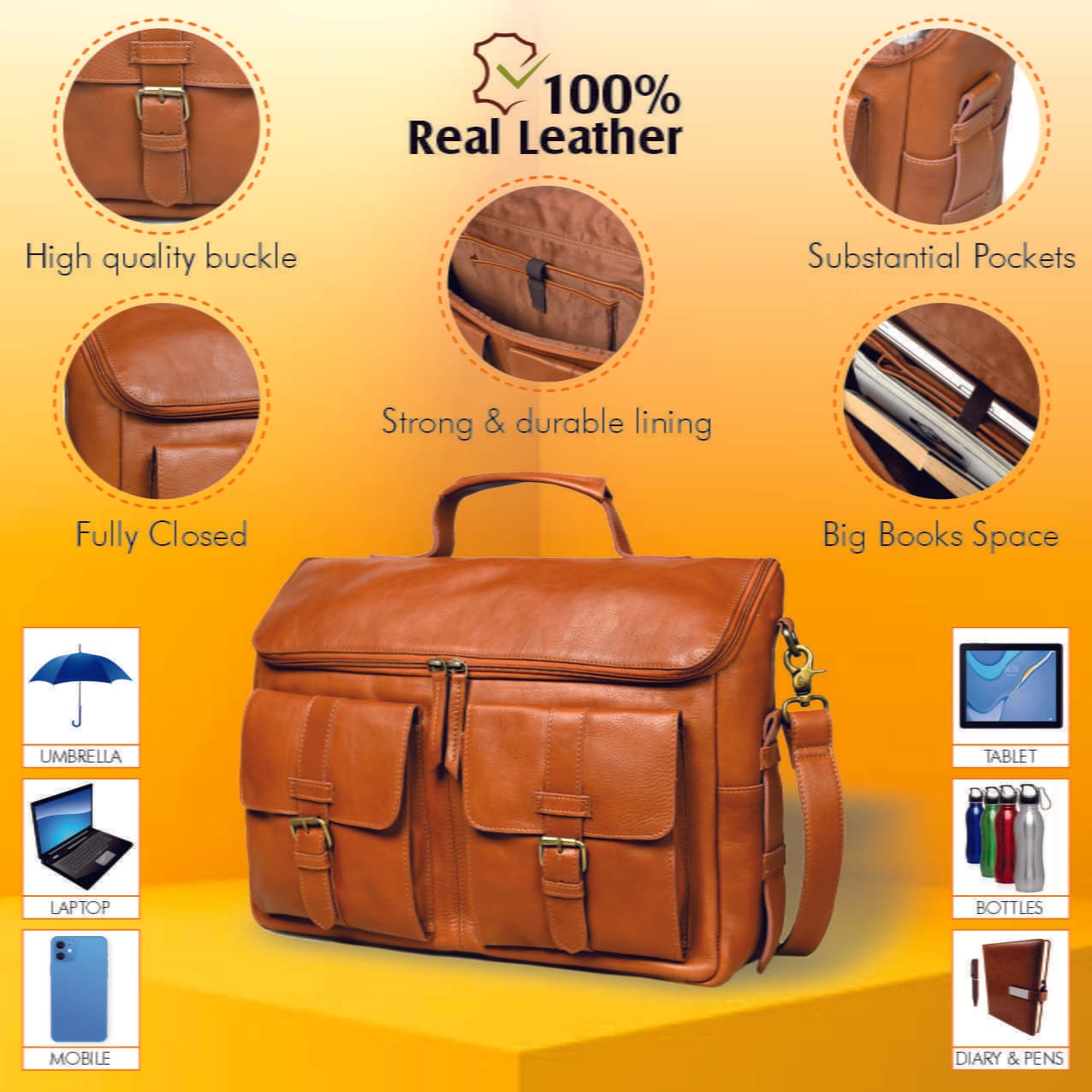 Elevate your daily routine with the Tan Cowhide Full Grain Leather Bag for Men. Crafted from the finest cowhide full-grain leather, this sophisticated briefcase combines timeless style with modern functionality. The multifunctional design includes front pockets, a magnetic closure, and a dedicated 15″ laptop compartment to keep you organized and productive on the go. Adjustable, removable straps and a top handle allow you to carry it however suits your needs best – whether commuting to the office, traveling for work, or just running errands around town. With its premium materials and compact, versatile size, this leather bag is the perfect accessory for the modern professional.