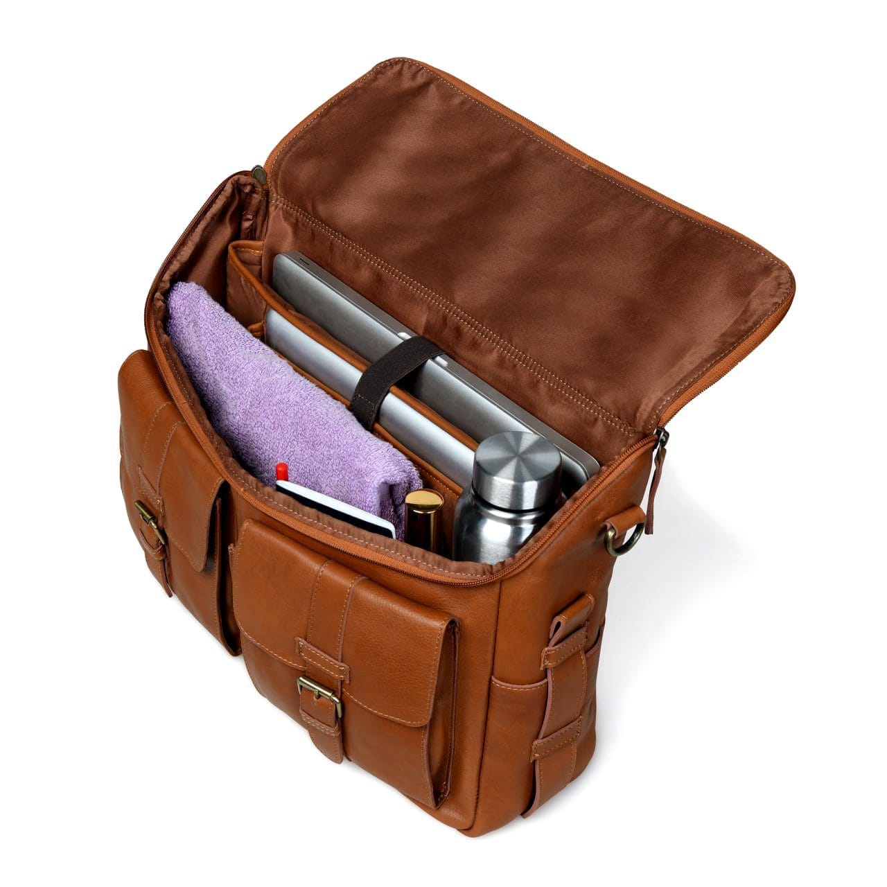 • Multifunctional design with front pockets, magnetic closure, and 15″ laptop sleeve